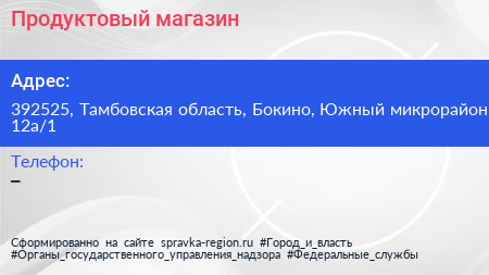 Продуктовый магазин по адресу 392525, Тамбовская область, Бокино, Южный микрорайон, 12а/1 в дальнейшем Организация, размещена в следующих категориях: