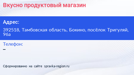 Вкусно, продуктовый магазин по адресу 392518, Тамбовская область, Бокино, посёлок Тригуляй, 96а в дальнейшем Организация, размещена в следующих категориях: