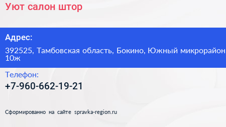Уют, салон штор по адресу 392525, Тамбовская область, Бокино, Южный микрорайон, 10ж в дальнейшем Организация, размещена в следующих категориях: