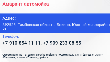 Амарант, автомойка по адресу 392525, Тамбовская область, Бокино, Южный микрорайон, 5в в дальнейшем Организация, размещена в следующих категориях: