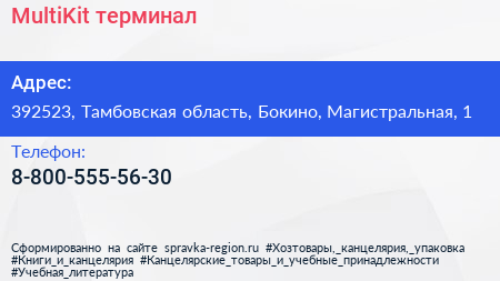 MultiKit, терминал по адресу 392523, Тамбовская область, Бокино, Магистральная, 1 в дальнейшем Организация, размещена в следующих категориях: