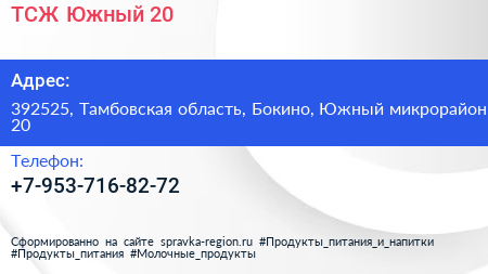 ТСЖ Южный 20 по адресу 392525, Тамбовская область, Бокино, Южный микрорайон, 20 в дальнейшем Организация, размещена в следующих категориях: