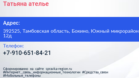 Татьяна, ателье по адресу 392525, Тамбовская область, Бокино, Южный микрорайон, 12д в дальнейшем Организация, размещена в следующих категориях: