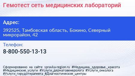 Гемотест, сеть медицинских лабораторий по адресу 392525, Тамбовская область, Бокино, Северный микрорайон, 42 в дальнейшем Организация, размещена в следующих категориях: