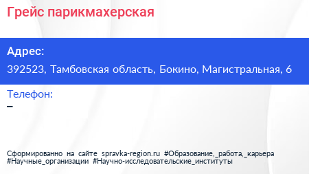 Грейс, парикмахерская по адресу 392523, Тамбовская область, Бокино, Магистральная, 6 в дальнейшем Организация, размещена в следующих категориях: