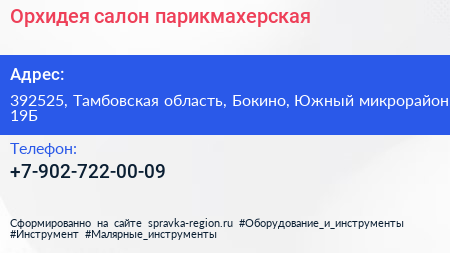 Орхидея, салон-парикмахерская по адресу 392525, Тамбовская область, Бокино, Южный микрорайон, 19Б в дальнейшем Организация, размещена в следующих категориях: