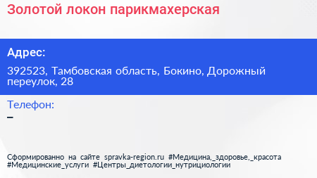 Золотой локон, парикмахерская по адресу 392523, Тамбовская область, Бокино, Дорожный переулок, 28 в дальнейшем Организация, размещена в следующих категориях: