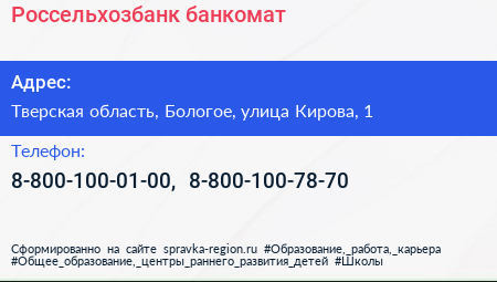 Россельхозбанк, банкомат по адресу Тверская область, Бологое, улица Кирова, 1 в дальнейшем Организация, размещена в следующих категориях: