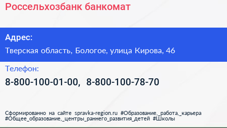 Россельхозбанк, банкомат по адресу Тверская область, Бологое, улица Кирова, 46 в дальнейшем Организация, размещена в следующих категориях: