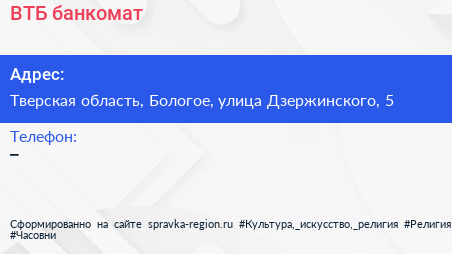 ВТБ, банкомат по адресу Тверская область, Бологое, улица Дзержинского, 5 в дальнейшем Организация, размещена в следующих категориях: