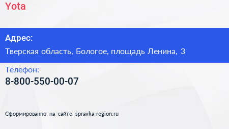 Yota по адресу Тверская область, Бологое, площадь Ленина, 3 в дальнейшем Организация, размещена в следующих категориях: