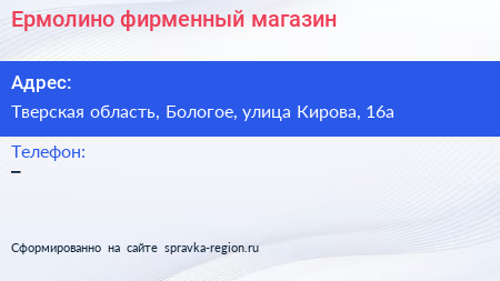 Ермолино, фирменный магазин по адресу Тверская область, Бологое, улица Кирова, 16а в дальнейшем Организация, размещена в следующих категориях: