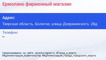 Ермолино, фирменный магазин по адресу Тверская область, Бологое, улица Дзержинского, 28д в дальнейшем Организация, размещена в следующих категориях: