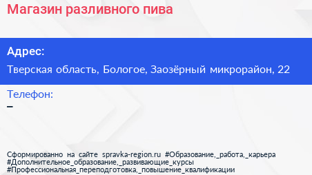 Магазин разливного пива по адресу Тверская область, Бологое, Заозёрный микрорайон, 22 в дальнейшем Организация, размещена в следующих категориях: