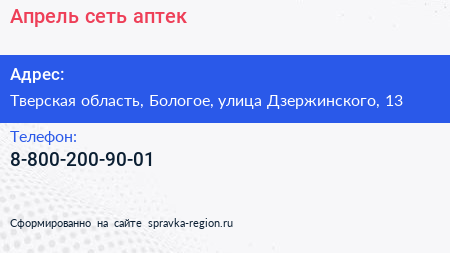 Апрель, сеть аптек по адресу Тверская область, Бологое, улица Дзержинского, 13 в дальнейшем Организация, размещена в следующих категориях: