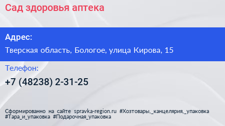 Сад здоровья, аптека по адресу Тверская область, Бологое, улица Кирова, 15 в дальнейшем Организация, размещена в следующих категориях: