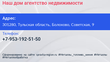 Наш дом, агентство недвижимости по адресу 301280, Тульская область, Болохово, Советская, 9 в дальнейшем Организация, размещена в следующих категориях:
