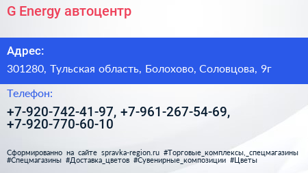 G-Energy, автоцентр по адресу 301280, Тульская область, Болохово, Соловцова, 9г в дальнейшем Организация, размещена в следующих категориях: