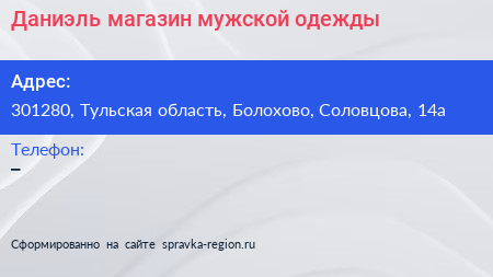 Даниэль, магазин мужской одежды по адресу 301280, Тульская область, Болохово, Соловцова, 14а в дальнейшем Организация, размещена в следующих категориях: