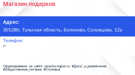 Магазин подарков по адресу 301280, Тульская область, Болохово, Соловцова, 12а в дальнейшем Организация, размещена в следующих категориях:
