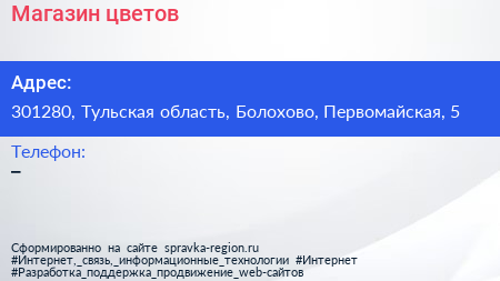 Магазин цветов по адресу 301280, Тульская область, Болохово, Первомайская, 5 в дальнейшем Организация, размещена в следующих категориях: