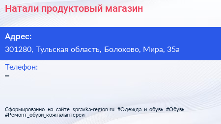 Натали, продуктовый магазин по адресу 301280, Тульская область, Болохово, Мира, 35а в дальнейшем Организация, размещена в следующих категориях: