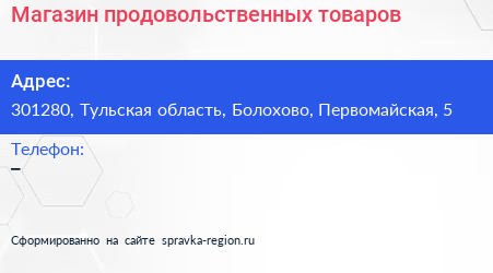 Магазин продовольственных товаров по адресу 301280, Тульская область, Болохово, Первомайская, 5 в дальнейшем Организация, размещена в следующих категориях: