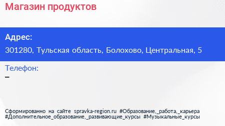 Магазин продуктов по адресу 301280, Тульская область, Болохово, Центральная, 5 в дальнейшем Организация, размещена в следующих категориях: