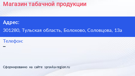 Магазин табачной продукции по адресу 301280, Тульская область, Болохово, Соловцова, 13а в дальнейшем Организация, размещена в следующих категориях: