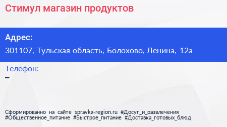 Стимул, магазин продуктов по адресу 301107, Тульская область, Болохово, Ленина, 12а в дальнейшем Организация, размещена в следующих категориях: