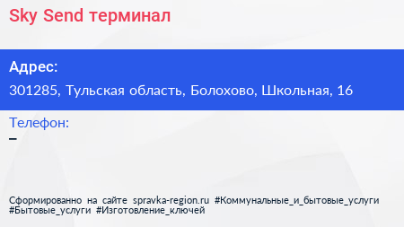Sky Send, терминал по адресу 301285, Тульская область, Болохово, Школьная, 16 в дальнейшем Организация, размещена в следующих категориях: