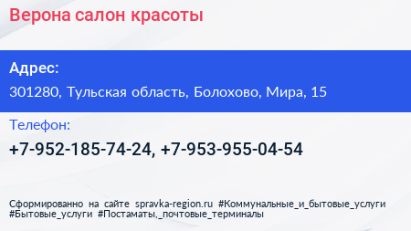 Верона, салон красоты по адресу 301280, Тульская область, Болохово, Мира, 15 в дальнейшем Организация, размещена в следующих категориях: