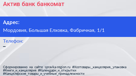 Актив банк, банкомат по адресу Мордовия, Большая Елховка, Фабричная, 1/1 в дальнейшем Организация, размещена в следующих категориях: