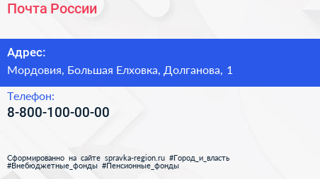 Почта России по адресу Мордовия, Большая Елховка, Долганова, 1 в дальнейшем Организация, размещена в следующих категориях: