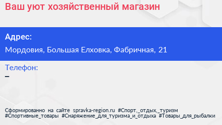 Ваш уют, хозяйственный магазин по адресу Мордовия, Большая Елховка, Фабричная, 21 в дальнейшем Организация, размещена в следующих категориях: