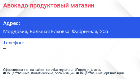 Авокадо, продуктовый магазин по адресу Мордовия, Большая Елховка, Фабричная, 20а в дальнейшем Организация, размещена в следующих категориях: