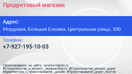 Продуктовый магазин по адресу Мордовия, Большая Елховка, Центральная улица, 100 в дальнейшем Организация, размещена в следующих категориях: