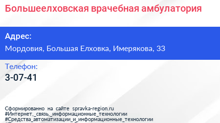 Большеелховская врачебная амбулатория по адресу Мордовия, Большая Елховка, Имерякова, 33 в дальнейшем Организация, размещена в следующих категориях: