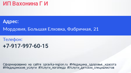 ИП Вахонина Г.И. по адресу Мордовия, Большая Елховка, Фабричная, 21 в дальнейшем Организация, размещена в следующих категориях: