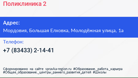 Поликлиника №2 по адресу Мордовия, Большая Елховка, Молодёжная улица, 1а в дальнейшем Организация, размещена в следующих категориях: