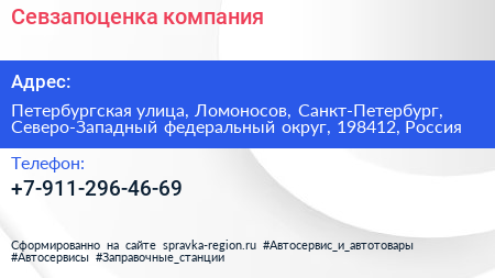 Севзапоценка, компания по адресу Петербургская улица, Ломоносов, Санкт-Петербург, Северо-Западный федеральный округ, 198412, Россия в дальнейшем Организация, размещена в следующих категориях:
