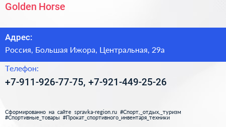 Golden Horse по адресу 29А, Центральная улица, Сойкино, Пениковское сельское поселение, Ломоносовский район, Ленинградская область, Северо-Западный федеральный округ, 188530, Россия в дальнейшем Организация, размещена в следующих категориях: