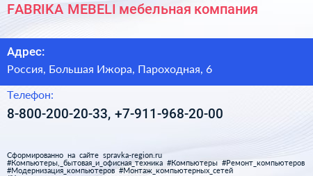 FABRIKA MEBELI, мебельная компания по адресу 6 литД, Пароходная улица, Большой порт Санкт-Петербург (Ломоносов), Троицкая слобода, Ломоносов, Санкт-Петербург, Северо-Западный федеральный округ, 198412, Россия в дальнейшем Организация, размещена в следующих категориях: