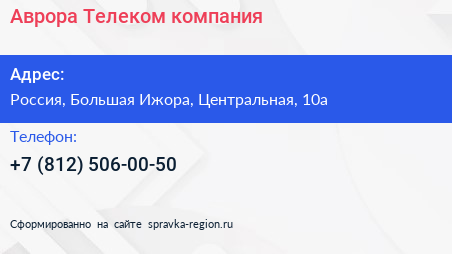 Аврора Телеком, компания по адресу 10А, Центральная улица, Бронна, Пениковское сельское поселение, Ломоносовский район, Ленинградская область, Северо-Западный федеральный округ, 188530, Россия в дальнейшем Организация, размещена в следующих категориях: