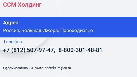 ССМ-Холдинг по адресу 6 литД, Пароходная улица, Большой порт Санкт-Петербург (Ломоносов), Троицкая слобода, Ломоносов, Санкт-Петербург, Северо-Западный федеральный округ, 198412, Россия в дальнейшем Организация, размещена в следующих категориях:
