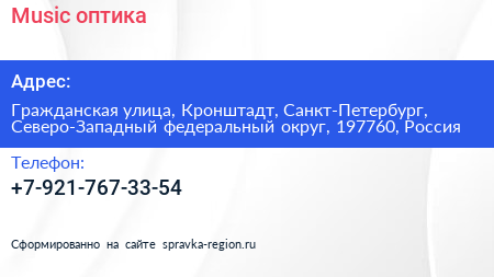 Music, оптика по адресу Гражданская улица, Кронштадт, Санкт-Петербург, Северо-Западный федеральный округ, 197760, Россия в дальнейшем Организация, размещена в следующих категориях: