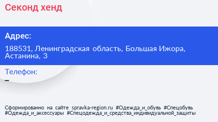 Секонд-хенд по адресу 188531, Ленинградская область, Большая Ижора, Астанина, 3 в дальнейшем Организация, размещена в следующих категориях: