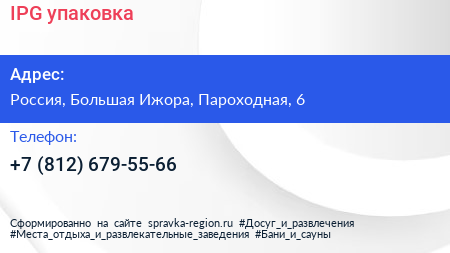 IPG упаковка по адресу 6 литД, Пароходная улица, Большой порт Санкт-Петербург (Ломоносов), Троицкая слобода, Ломоносов, Санкт-Петербург, Северо-Западный федеральный округ, 198412, Россия в дальнейшем Организация, размещена в следующих категориях: