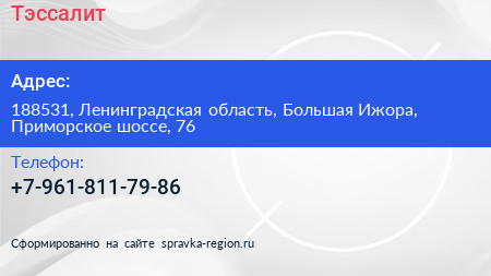 Тэссалит по адресу 188531, Ленинградская область, Большая Ижора, Приморское шоссе, 76 в дальнейшем Организация, размещена в следующих категориях: