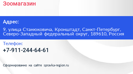Зоомагазин по адресу 9, улица Станюковича, Кронштадт, Санкт-Петербург, Северо-Западный федеральный округ, 189610, Россия в дальнейшем Организация, размещена в следующих категориях: